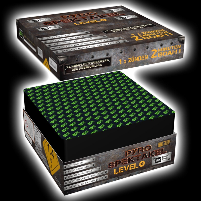 XL Verbundfeuerwerk der Premiumklasse, bestehend aus 9 verschiedenen Batterien mit insgesamt 13 verschiedenen Effektkombinationen in folgender Performance: 1. Rote Schweifchrysanthemen abwechselnd mit Goldflimmersternen und Cracklingblüten kombiniert und mit rotem Kometenschweif aufsteigend. 2. Große, füllige Goldweidenbuketts. 3.+4. Gold-Blaue Kometen, im Zickzack-Fächer geschossen, verwandeln zu Brokatkronen mit blauen Spitzen und rotem Blütenregen mit blauen Sternen. 5. Große Dahlienbuketts mit kräftigen Trend-Farben in Rot, Purpur und Gelb, immer kombiniert mit fülligem Silberblinker. 6. Goldflimmerschweifkometen verwandeln zu großen Buketts aus Goldflimmerkronen. 7.+8. Im Zickzack geschossene Feuertöpfe aus Silberflimmer in Kombination mit Goldschweifkometen werden getoppt von einer Kombination aus Brokat-Cracklingblüten und Titangold-Weiden.